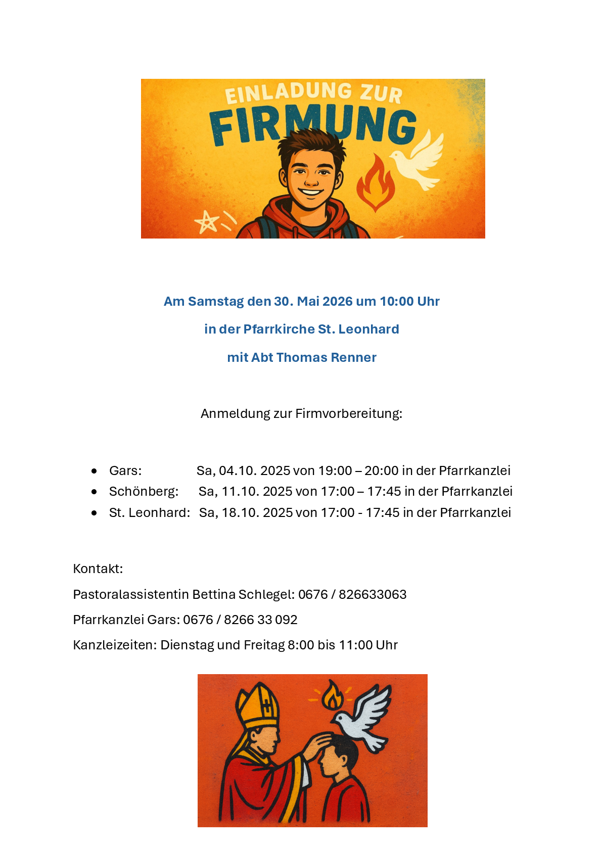 Die Firmung am 2. Mai 2020 wurde verschoben auf das Frühjahr 2021 - die neuen beiden Termine sind für den Jahrgang 2019/2020 - der 12. Juni 2021 und für den Jahrgang 2020/2021 - der 19. Juni 2021 - jeweils um 9 Uhr in der Pfarrkirche St. Leonhard.