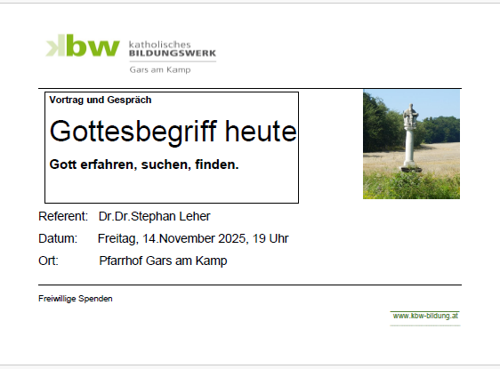 Ein Jahr mit sehr unterschiedlichen Veranstaltungen liegt hinter uns: Auf den interessanten Bibelabend in der Fastenzeit folgte im April ein gut besuchter Pilgerwandertag von Gars nach Tautendorf. Sehr spannend war die Lesung mit dem österreichisch-syrischen Autor Omar Khir Alanam im Mai. Der meditative Tanzabend “Tanzend beten - betend tanzen“ in kleinem Kreise fand vor der Sommerpause statt. Mit dem „Letzte Hilfe-Kurs“ im Oktober konnte eine ausgewählte Zielgruppe gut angesprochen werden. Der Vortrag „Gottesbegriff heute“ im November (siehe Foto!) schloss das Veranstaltungsjahr 2025 ab.
