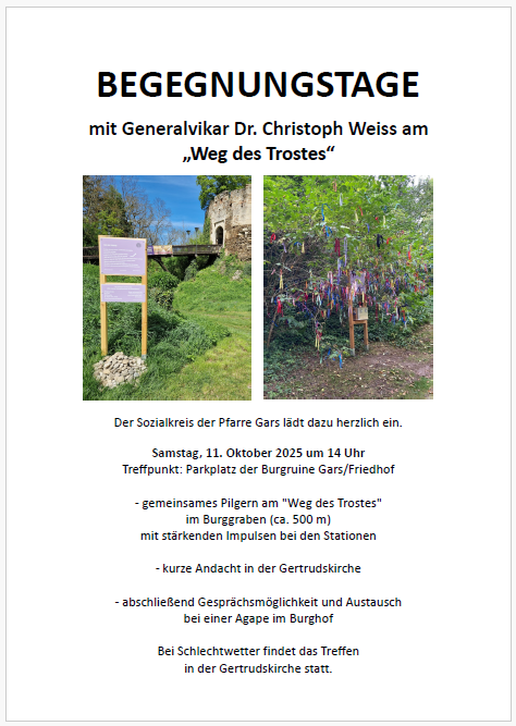 Sollten Sie ein Anliegen an den Sozialkreis haben, wenden Sie sich an das Sekretariat der Pfarre (02985-2238)
