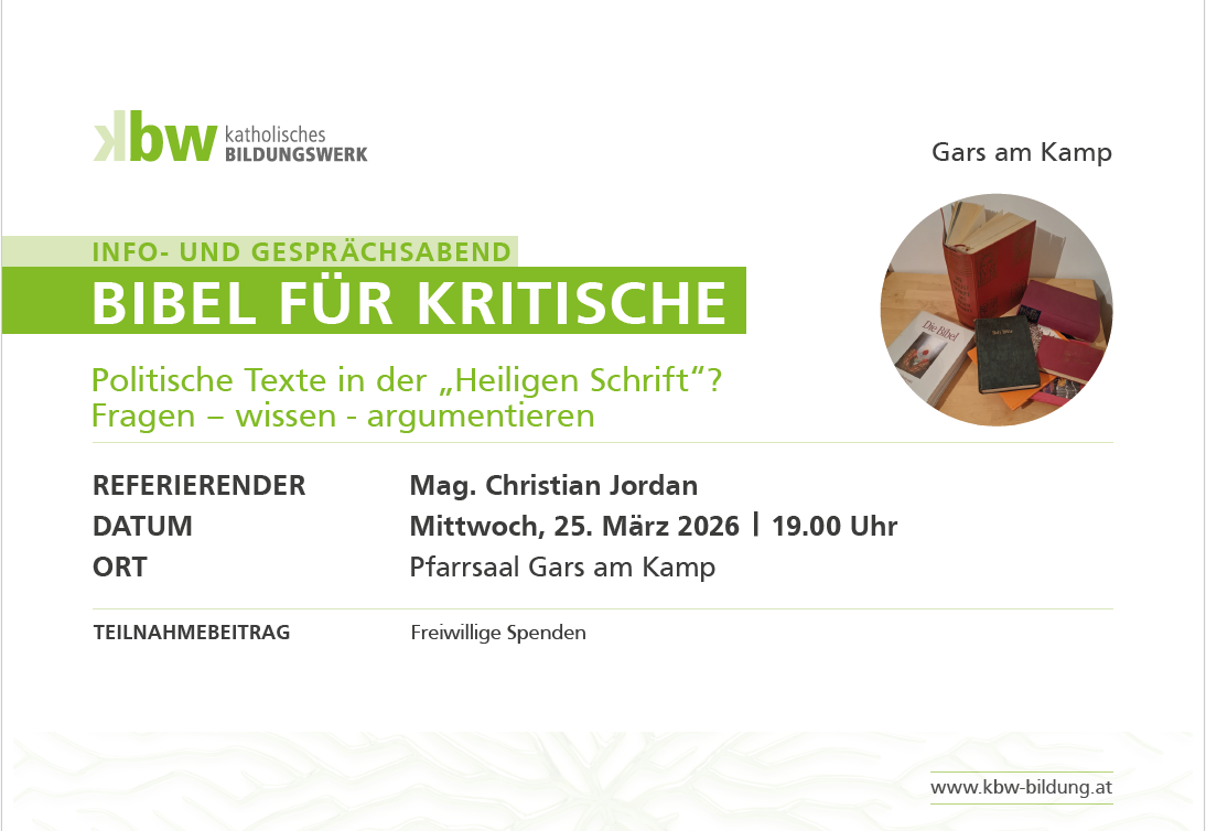 Ein Jahr mit sehr unterschiedlichen Veranstaltungen liegt hinter uns: Auf den interessanten Bibelabend in der Fastenzeit folgte im April ein gut besuchter Pilgerwandertag von Gars nach Tautendorf. Sehr spannend war die Lesung mit dem österreichisch-syrischen Autor Omar Khir Alanam im Mai. Der meditative Tanzabend “Tanzend beten - betend tanzen“ in kleinem Kreise fand vor der Sommerpause statt. Mit dem „Letzte Hilfe-Kurs“ im Oktober konnte eine ausgewählte Zielgruppe gut angesprochen werden. Der Vortrag „Gottesbegriff heute“ im November (siehe Foto!) schloss das Veranstaltungsjahr 2025 ab.
